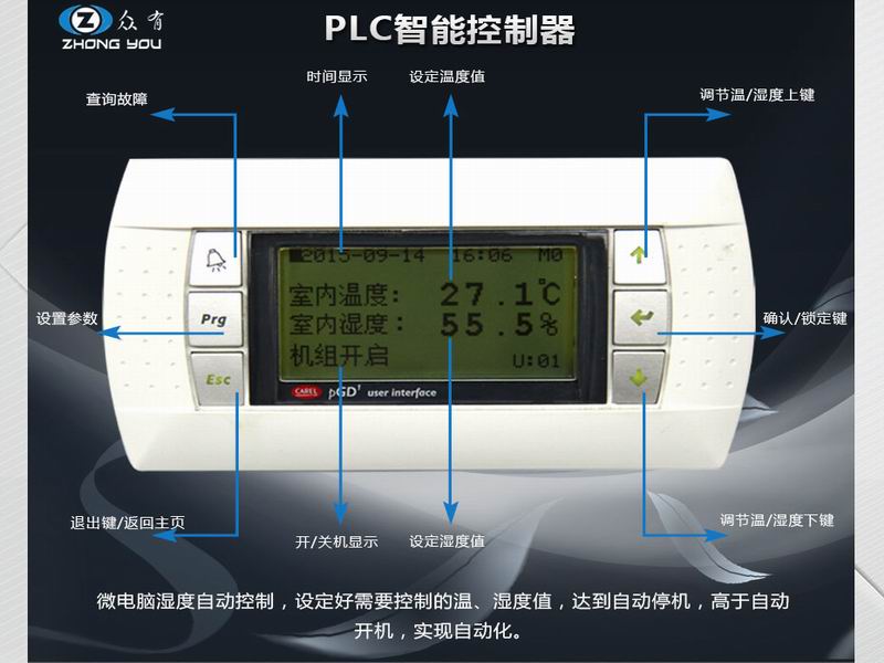 風冷降溫型除濕機采用高性能可編程控制儀表??刂凭雀?,可靠性好。該儀表 預留有遠程控制接口,可方便用戶遠程集中控制,節省管理人力。