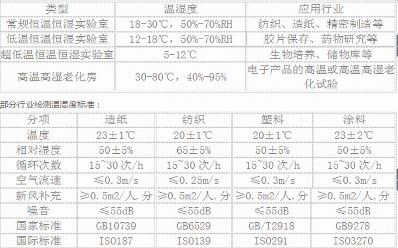 恒溫恒濕實(shí)驗(yàn)室是將某一實(shí)驗(yàn)室通過某些專用設(shè)備和技術(shù)方法 ,使其室內(nèi)溫濕度符合某一調(diào)濕和試驗(yàn)用標(biāo)準(zhǔn)大氣的要求。恒溫恒濕實(shí)驗(yàn)室是生產(chǎn)企業(yè)的產(chǎn)品質(zhì)量檢驗(yàn)與控制和流通領(lǐng)域里的商品質(zhì)量檢驗(yàn)把關(guān)的基礎(chǔ)設(shè)施。恒溫恒濕實(shí)驗(yàn)室廣泛應(yīng)用于棉紡、毛紡、化纖、紙張、包裝、煙草生產(chǎn)企業(yè)以及質(zhì)檢、纖檢等部門,按照ISO和GB有關(guān)標(biāo)準(zhǔn)規(guī)定,紡織品、紡織原料、紙張、紙品和紙箱等 商品的質(zhì)物理項(xiàng)目的檢驗(yàn)必需在標(biāo)準(zhǔn)大氣條件下進(jìn)行。紡織品和紡織原料檢驗(yàn)的標(biāo)準(zhǔn)大氣按ISO139和GB6529標(biāo)準(zhǔn)規(guī)定,溫度20±1 ℃,相對(duì)濕度65%±5%;紙張、紙品和紙箱類商品檢驗(yàn)的標(biāo)準(zhǔn)大氣按照ISO187和GB10739標(biāo)準(zhǔn)規(guī)定,溫度23±1℃,相對(duì)濕度50%±5%。除了常規(guī)溫濕度的恒溫恒濕實(shí)驗(yàn)室,還有其它特殊的5-18℃低溫、30-80℃高溫、相對(duì)濕度要求小于40%RH低濕、相對(duì)濕度高于80%RH的高濕等特殊要求的恒溫恒濕實(shí)驗(yàn)室。